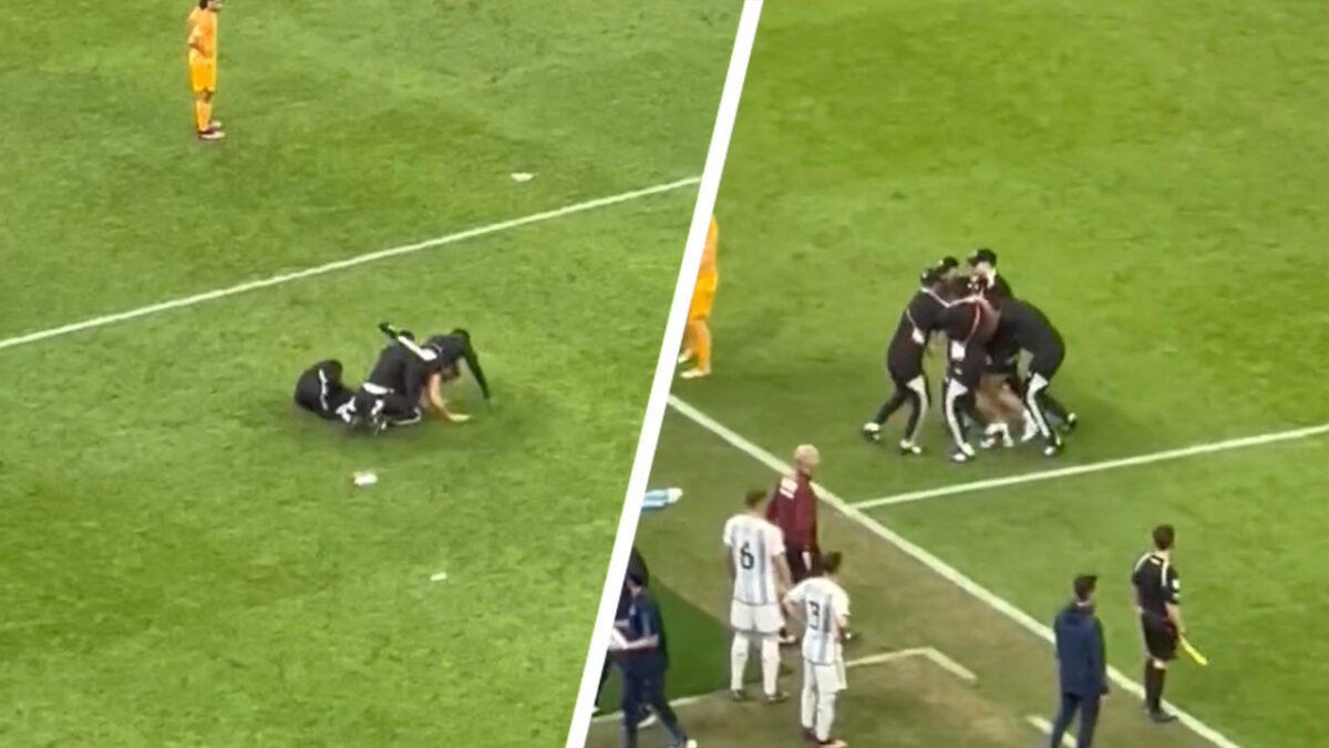 Mafklapper rent het veld op tijdens Nederland - Argentinië, wordt door 6 beveiligers weggesleurd