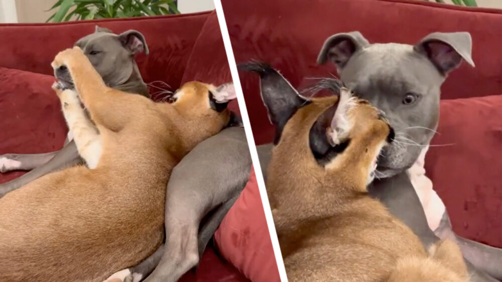 De haat-liefdeverhouding tussen een caracal en een stafford Dieren