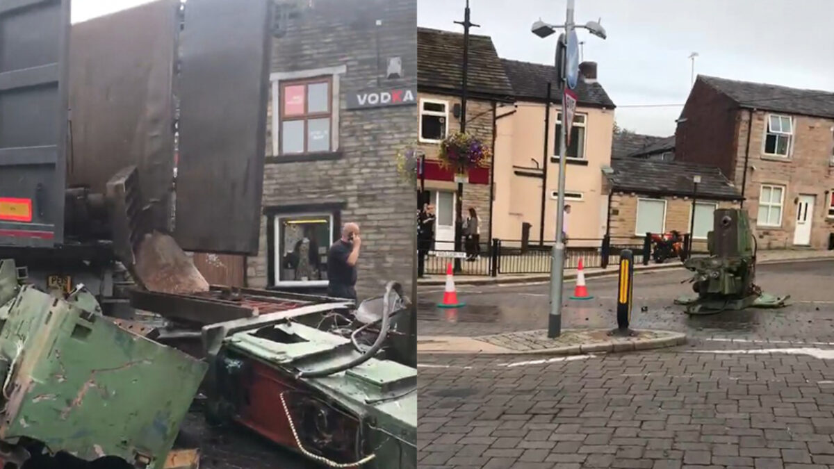 Vrachtwagenchauffeur heeft slechte dag en dumpt lading zware industriële machines op straat