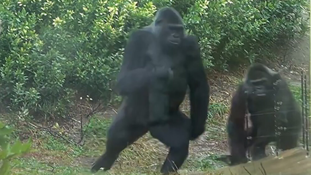 Gorilla's zijn net mensen en haten regen ook. Gevalletje oude doos, maar hup snel naar binnen voordat we nat worden.