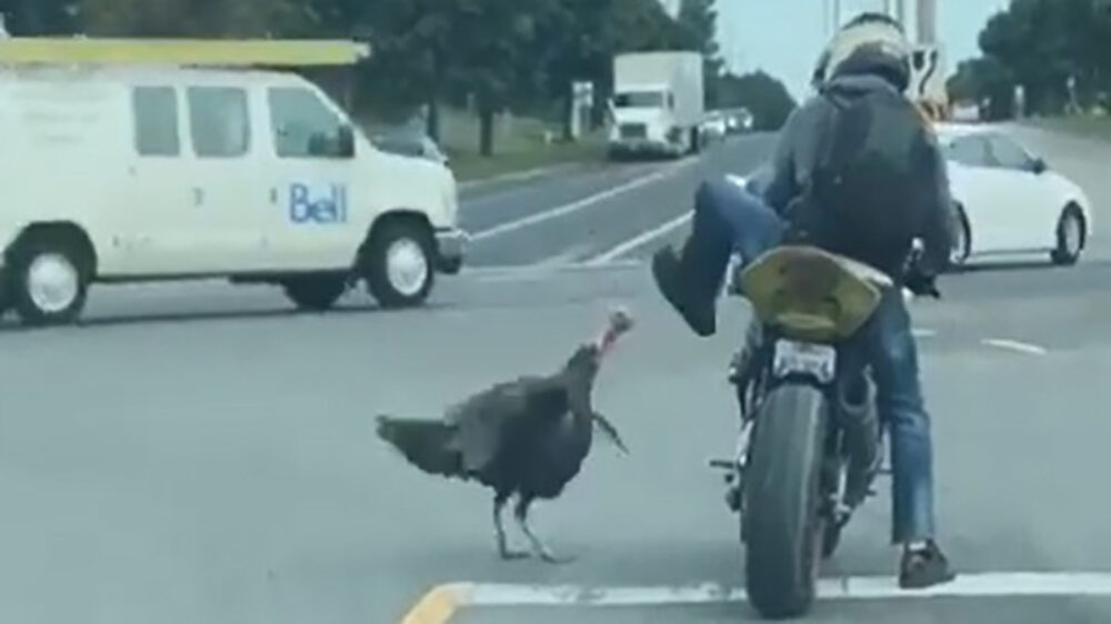 Een niet alledaagse road rage tussen een motorrijder en een kalkoen