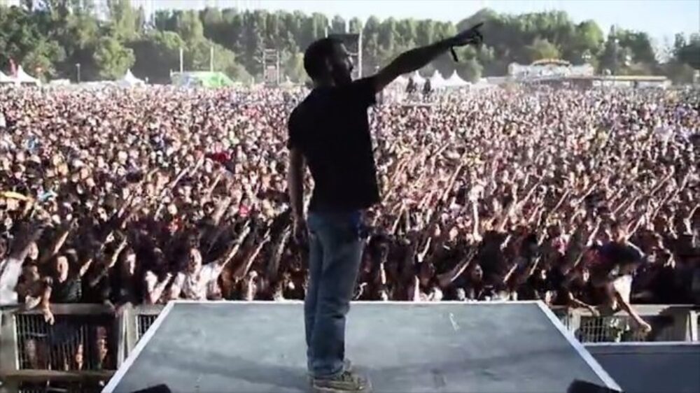 Als er geen voorprogramma is dan moet het publiek zich maar met de geluidstechnicus vermaken. Lukt aardig zo te zien, stelletje kuddedieren!