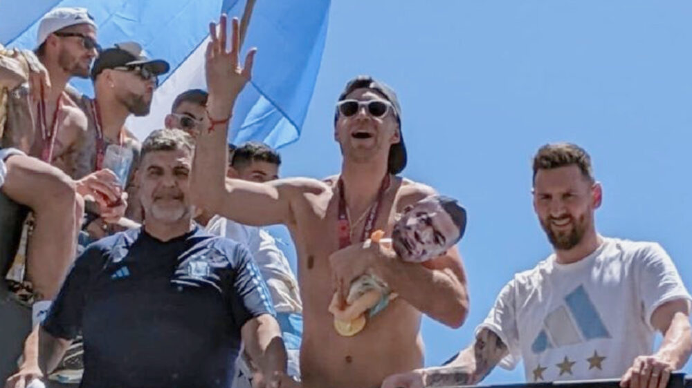 Nadat er beelden opdoken van het onsportieve gedrag van de Argentijnse keeper Emiliano Martínez tijdens de WK-finale blijkt hij ook tijdens de feestelijkheden behoorlijk kinderachtig bezig te zijn geweest. Hij droeg tijdens de optocht namelijk een babypop bij zich, met daarop het hoofd van Kylian Mbappé. Deze pop kreeg hij overigens door het publiek toegeworpen, maar hij ging er trots mee op de foto.