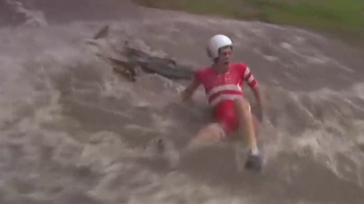 Een paar drupjes zal de gemiddelde wielrenner niet zo deren, maar als het water in deze hoeveelheden op de straat ligt is wellicht een tijdrit niet het allerbeste idee.