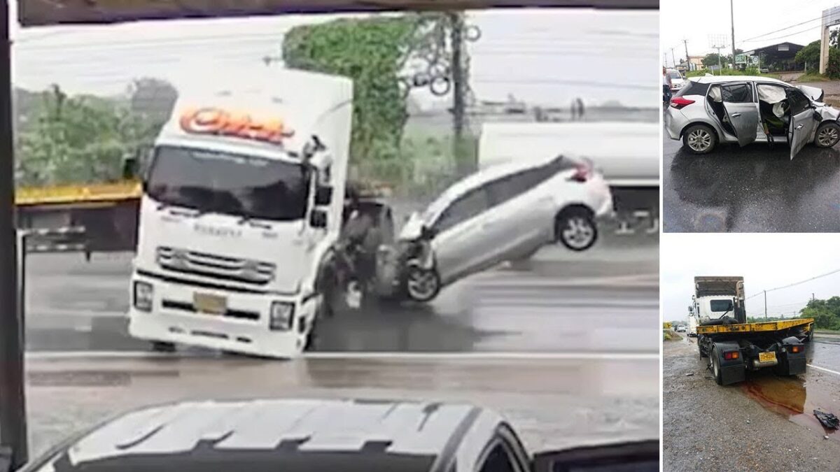 Thaise automobilist klapt hard op glibberende vrachtwagen door nat wegdek