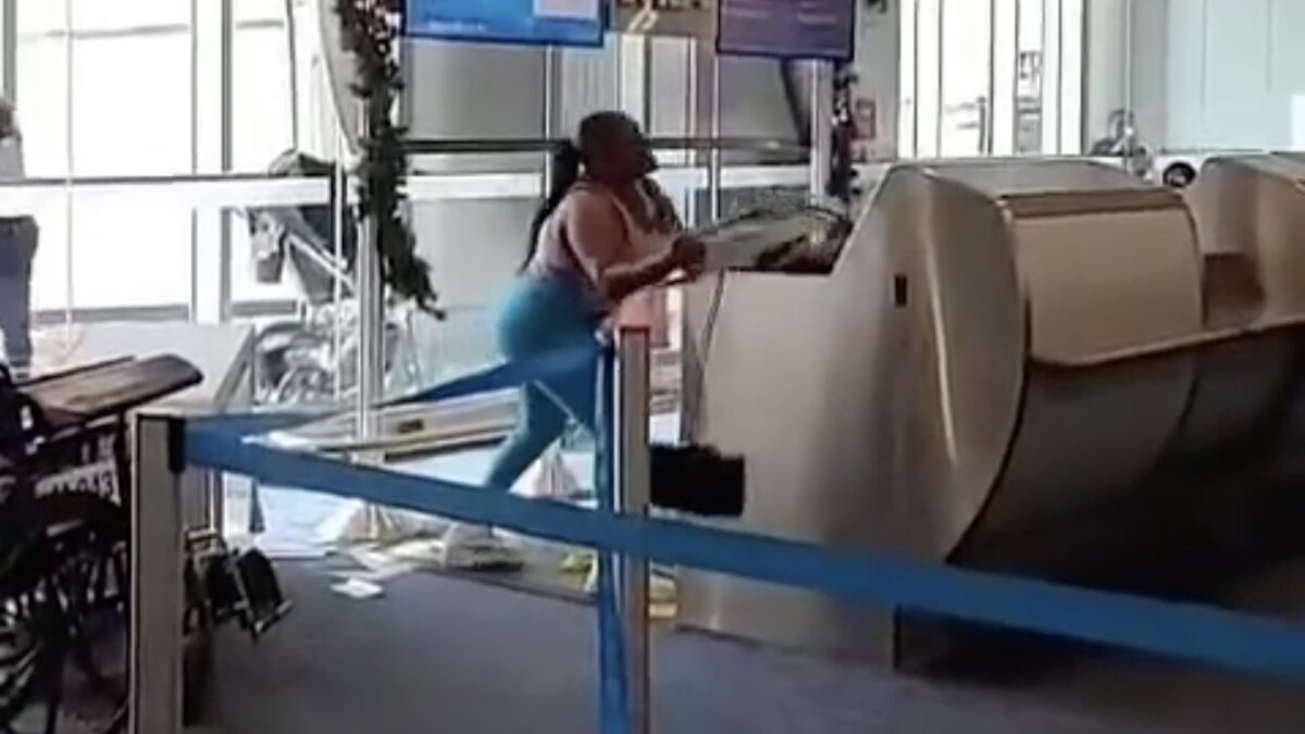 Vrouw in flipmode op vliegveld van Miami en breekt de tent volledig af