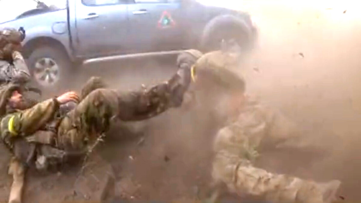 Deze Oekraïense soldaten kregen de taak om een mortier te verplaatsen, maar net toen ze begonnen met inladen landde er een (naar verluidt) Russische mortier naast ze. Wonderbaarlijk genoeg raakte niemand gewond en ging ze er onverrichter zake vandoor.