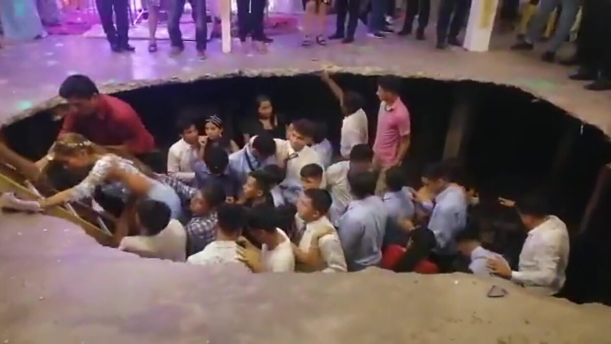 Wat een mooi eindejaarsfeestje had moeten worden verliep iets anders en viel letterlijk in duigen. Te zien is hoe studenten in de regio San Martin in Peru naar beneden storten nadat de dansvloer het voor gezien houdt. Een aantal feestgangers is naar het ziekenhuis gebracht, maar het bleef gelukkig bij enkele lichte verwondingen.
