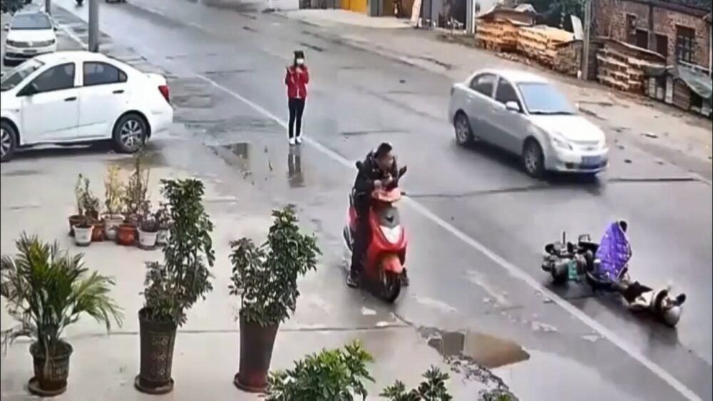 Een Chinese vrouw klapt met haar scooter tegen de grond als ze uitglijdt op een nat wegdek. Ze blijft stuiptrekkend op het asfalt liggen, maar geen van de voorbijgangers maakt aanstalten om haar te helpen. Triest, maar het komt (schijnbaar) doordat ze in China bang zijn om aansprakelijk gesteld te worden.