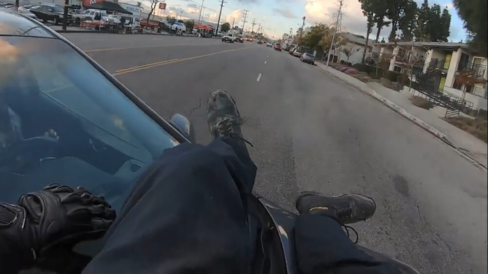 Motorrijder klapt tegen auto en landt met een salto netjes op de motorkap