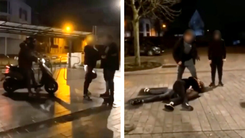 Nare beelden uit het Belgische Lommel waarin een 17-jarige bromfietser met een groepje 'jongemannen' ruzie krijgt. De aanleiding is niet bekend, maar nadat hij met zijn scooter op één persoon inrijdt wordt hij naar de grond geslagen en op zijn hoofd geschopt.