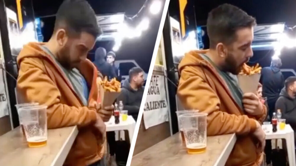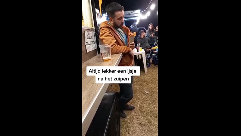 Geen idee hoeveel je moet drinken om je puntzak #patat voor een ijsje aan te zien, maar deze man is het in ieder geval gelukt. Is 'ie lekker tijger?