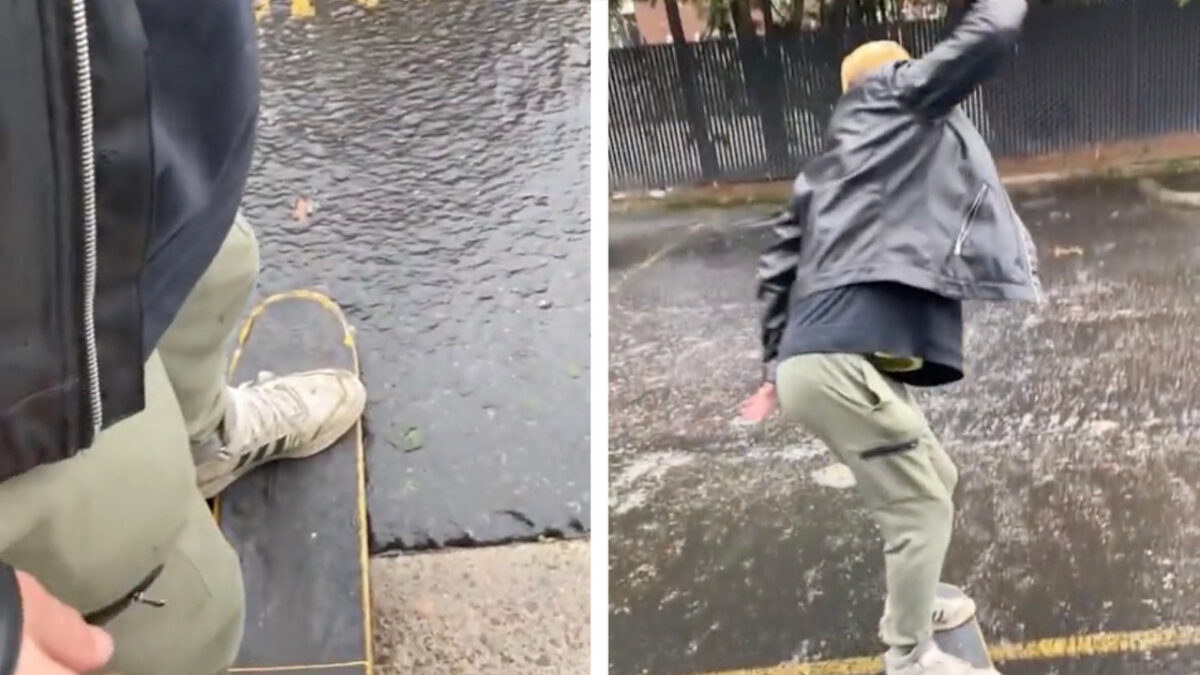 Heb je wel eens meegemaakt dat het zoveel geijzeld heeft dat je al schaatsend of skateboardend over de weg kunt glijden? Deze stuntpiloot blijkbaar wel, maar of hij er écht blij mee is wagen we te betwijfelen.