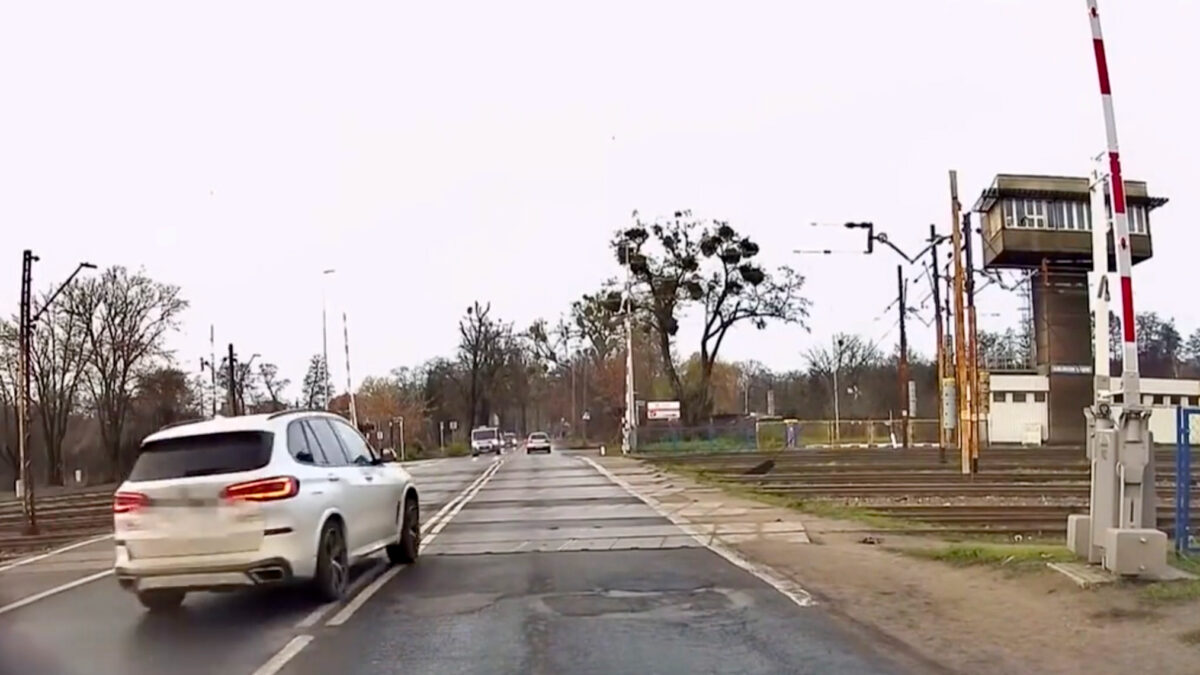 Instant karma voor vent die last minute over spoorwegovergang knalt