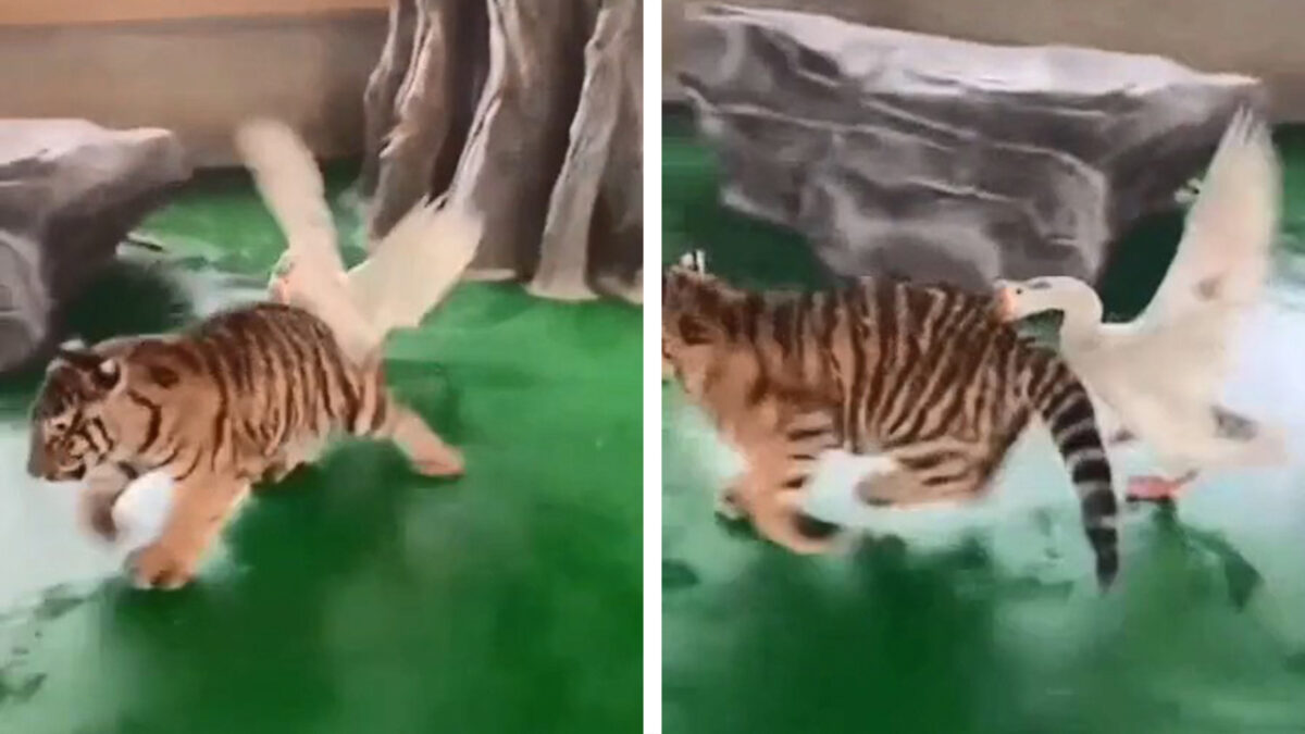 Een blije tijgerwelp loopt lekker te klieren en achtervolgt een lijpe gans, maar na een tijdje draaiden de rollen om en weet 'ie niet hoe snel hij zijn hok in moet rennen. Mamaaaa!