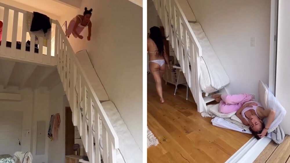 Je zou natuurlijk kunnen denken dat als je een #matras op de trap legt het enigszins de klap opvangt, maar waarschijnlijk was het er een met pocketvering want ze stuitert bijna dwars door de muur.