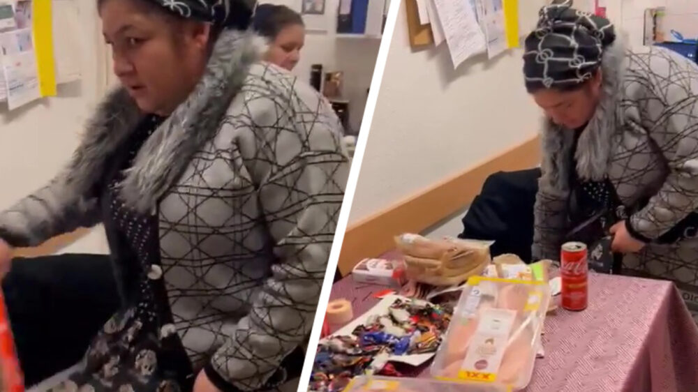 Deze dievegge werd betrapt en laat even zien hoeveel dagen eten er onder haar jurk waren verdwenen.