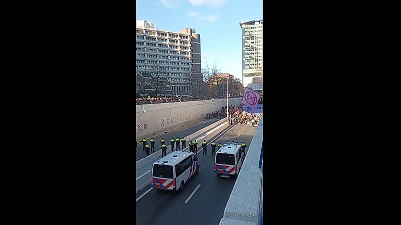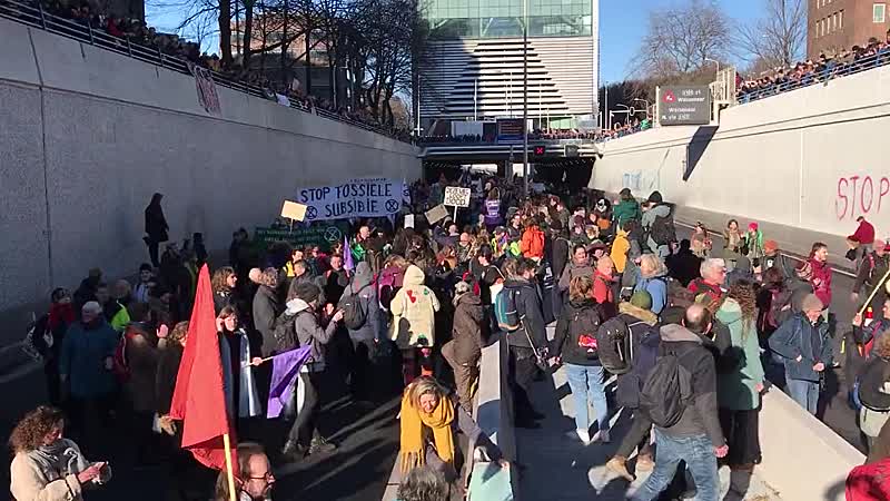 Actievoerders lijmden zich via een buis aan elkaar vast. Langs de zijkanten van de weg en boven de tunnel stonden veel toeschouwers die de actievoerders op de weg aanmoedigen en de politie uitjoelen. Zij luisterden niet naar de oproep van de politie om richting het Malieveld te gaan. (bron: NU)