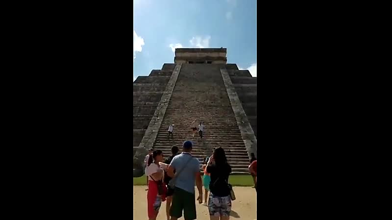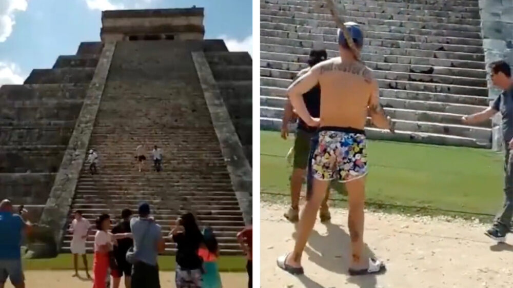 Respectloze toerist die op een Maya-tempel klimt wordt met stok gemept