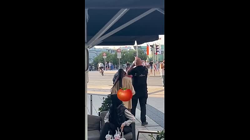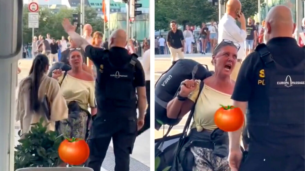 Het komt wellicht een beetje agressief over, maar dit is gewoon een Duitse vrouw die aan deze politieagent vraagt waar ze een ijsje kan kopen.