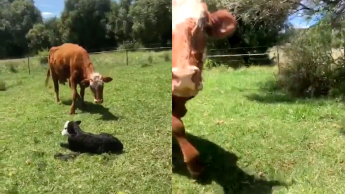 Sowieso is het niet echt aan te raden om kersverse moeders lastig te vallen, ook niet als het om mensen gaat, maar als een koe dus op deze manier met haar voorpoten in de grond klauwt kun je maar beter gaan rennen vriend.