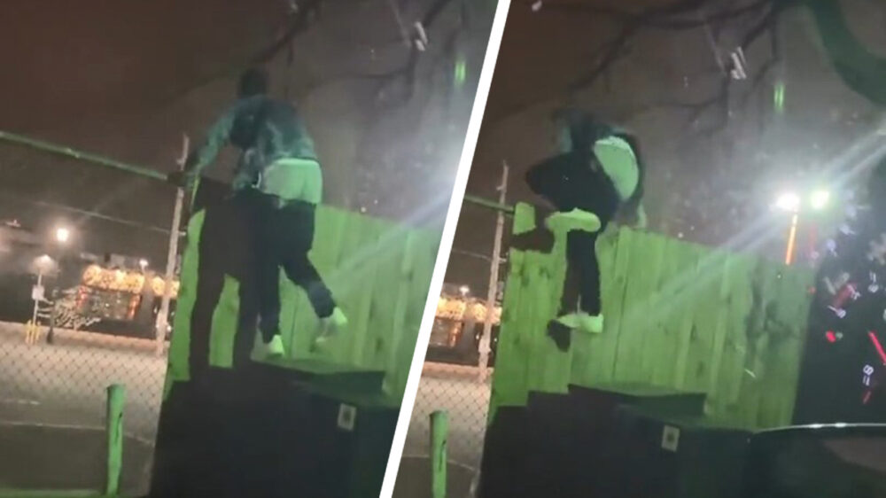 Nu hing zijn broek al op half zeven, maar na zijn hardcore parkour-actie kan hij sowieso op zoek naar een nieuwe. Misschien ligt het aan ons, maar volgens mij probeert iemand zijn auto te starten?!