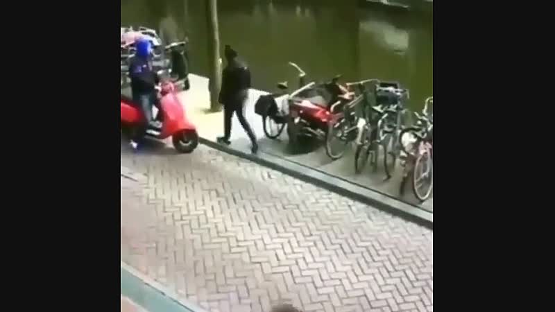 Sjap met capuchon heeft ietwat moeite om zijn scooter te parkeren Fails