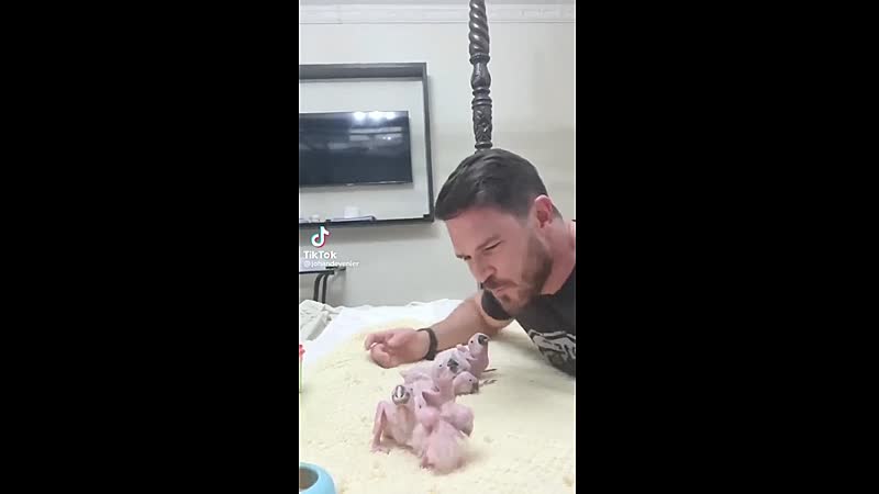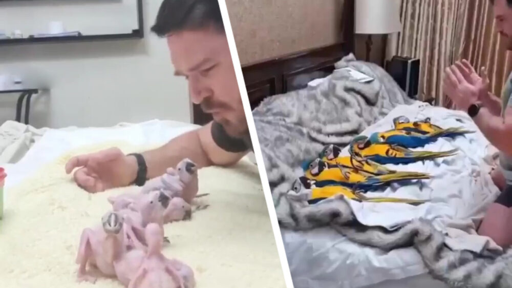In de natuur bestaat er zoiets als 'imprinting'. Dit houdt in dat sommige dieren zich verbonden blijven voelen aan het eerste soort wezen dat ze tegenkomen. In dit geval was dat de mens, en sindsdien is deze man de trotse moeder van een heel nest papegaaien.
