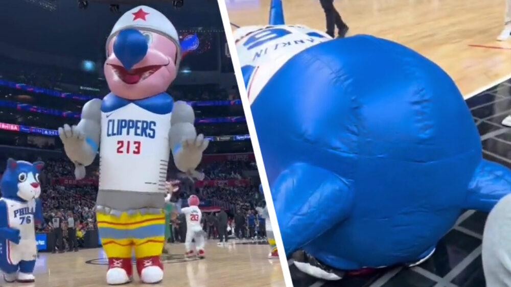 Mascottes bij sportwedstrijden zijn er om het publiek te vermaken, maar blijkbaar ook om ze zich helemaal de tandjes te laten schrikken.