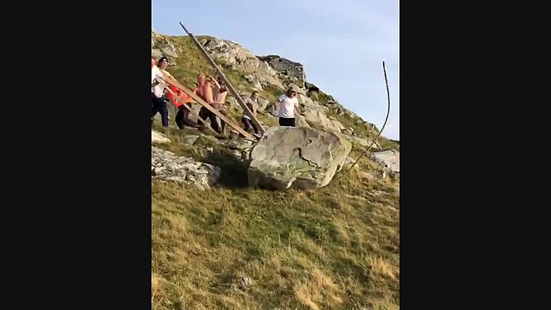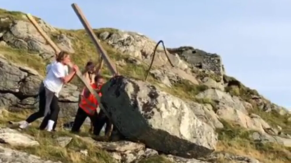 Mannen blijven mannen en joekelen een enorm rotsblok de zee in