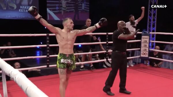 Bokser Hakim Ketaieb krijgt zo'n harde klap dat hij spontaan denkt de wedstrijd te hebben gewonnen