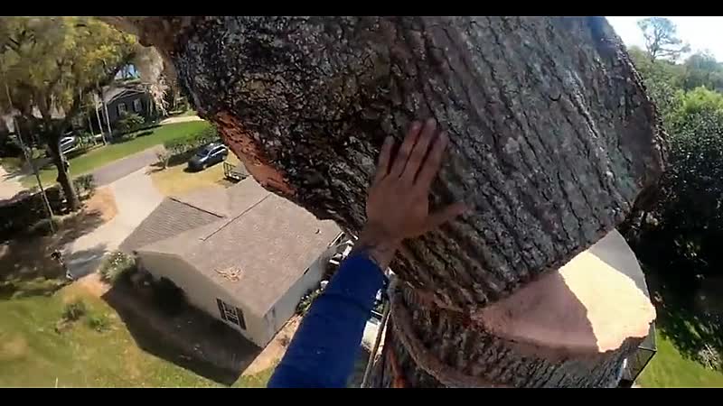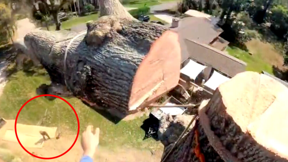 Boomstam valt precies op het been van de buurman die beneden staat te trekken