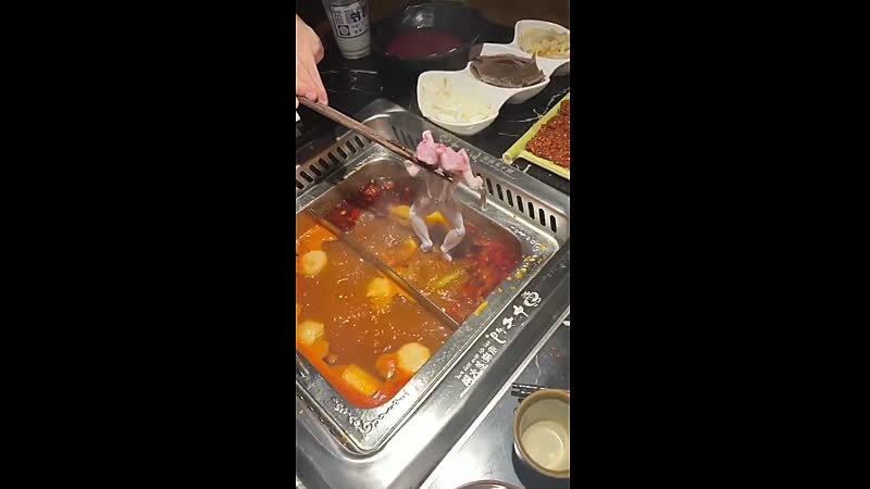 Een hotpot is een Chinese fondue waarbij een warmtebron op de eettafel een pot soepbouillon laat sudderen en je een verscheidenheid aan etenswaren in de hete bouillon moet mikken. Klinkt best lekker als je het ons vraagt, al heeft deze kikker er niet zo'n zin in.