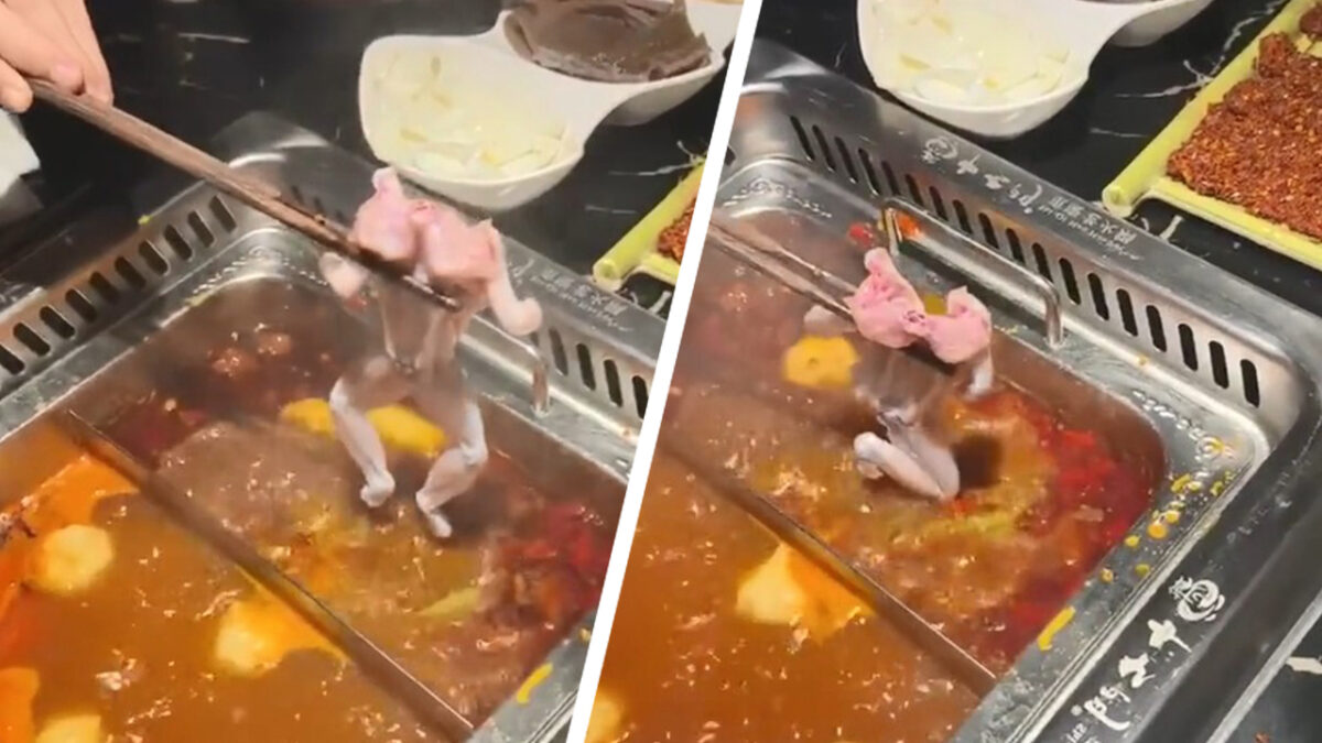 Een hotpot is een Chinese fondue waarbij een warmtebron op de eettafel een pot soepbouillon laat sudderen en je een verscheidenheid aan etenswaren in de hete bouillon moet mikken. Klinkt best lekker als je het ons vraagt, al heeft deze kikker er niet zo'n zin in.