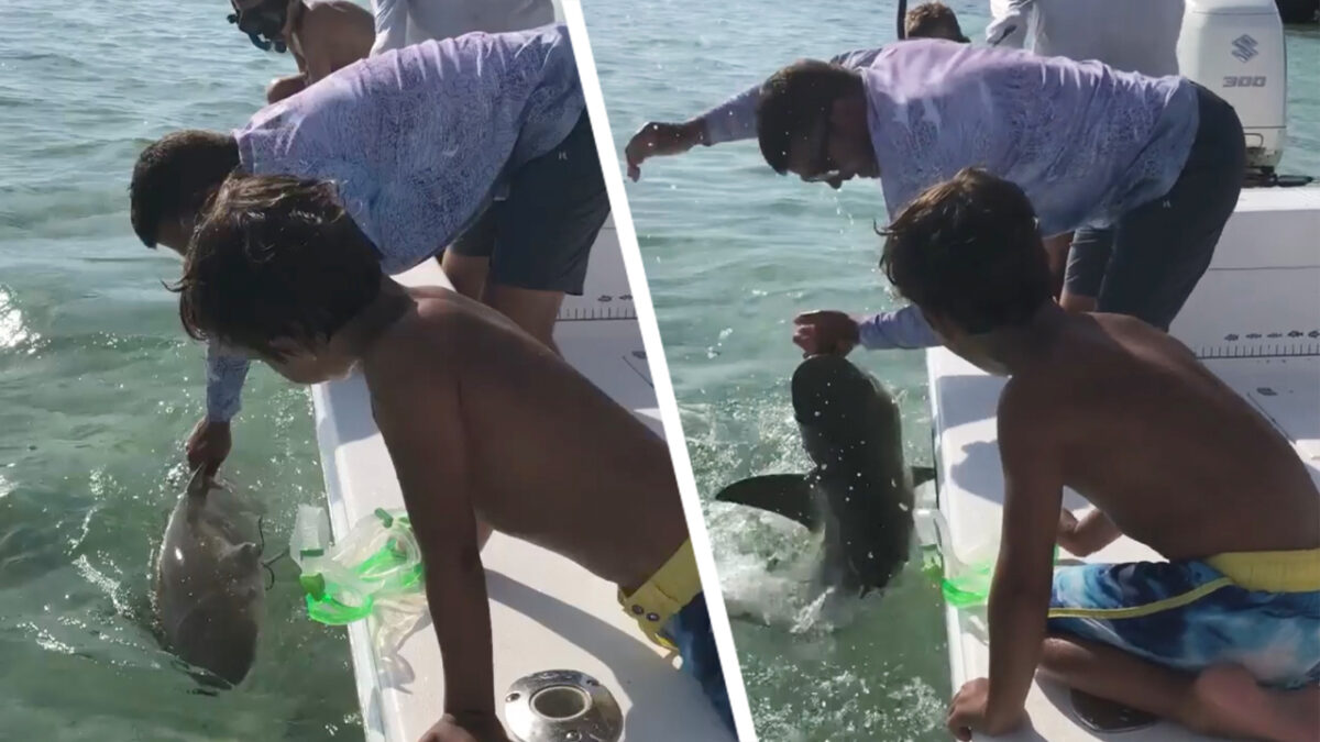 Papa doet wel even voor hoe je een haai met je blote mannenklauwen vangt