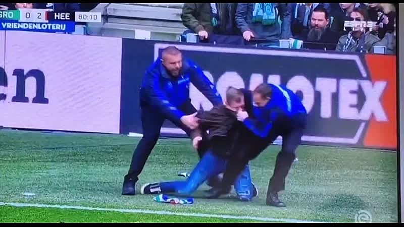 Een steward kon hem tegenhouden maar vervolgens ontstond er gedoe in een supportersvak achter een van de doelen. Jetro Willems, een speler van Groningen, probeerde de fans tot bedaren te brengen, maar als dank werd 'ie op z'n bakkes getimmerd door een 'supporter'. Scheidsrechter Serdar Gözübüyük legde de wedstrijd meteen stil die Heerenveen met 0-2 leidde.