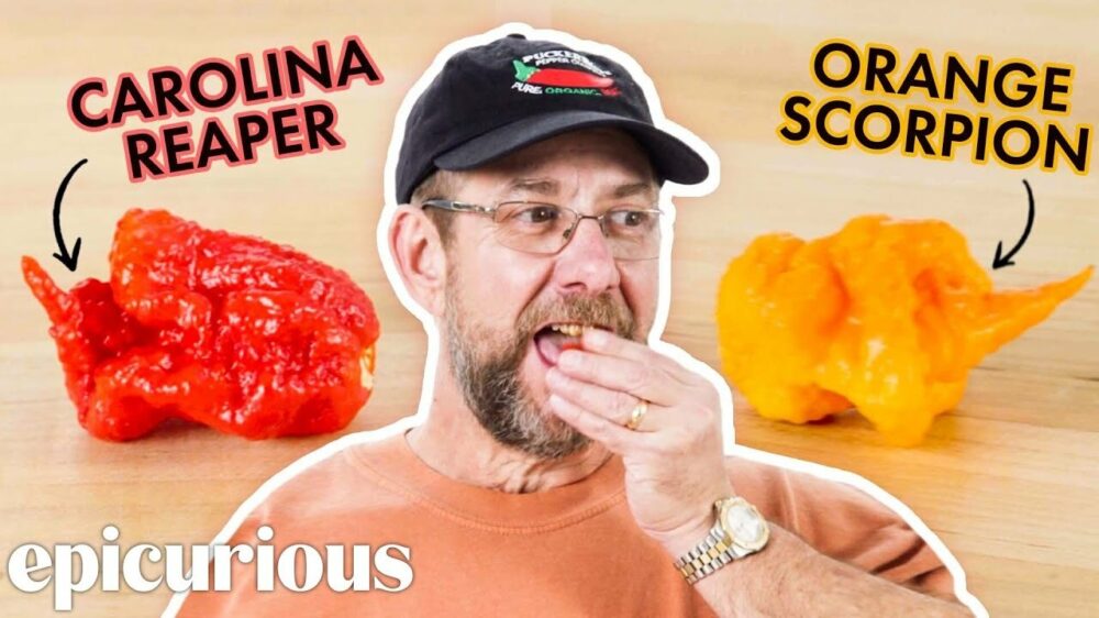 Peperkweker Smokin' Ed Currie is vooral bekend door het kweken van de heetste peper ter wereld: de Carolina Reaper. Edje weet dus wel het nodige over smaakcomplexiteit en hitte en vandaag bezoekt hij Epicurious om 10 van de meest heftige chili's ter wereld te proeven en te rangschikken.
