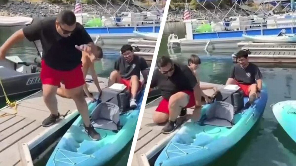 Het lijkt misschien gemakkelijk, maar niet iedereen stapt moeiteloos een kajak in. Je kunt een peddel gebruiken om je evenwicht te bewaren of je volgt gewoon het advies op van je vrienden. Bedankt hè!
