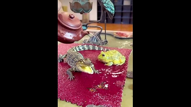 Babyalligator geniet met volle teugen van een heerlijke douche