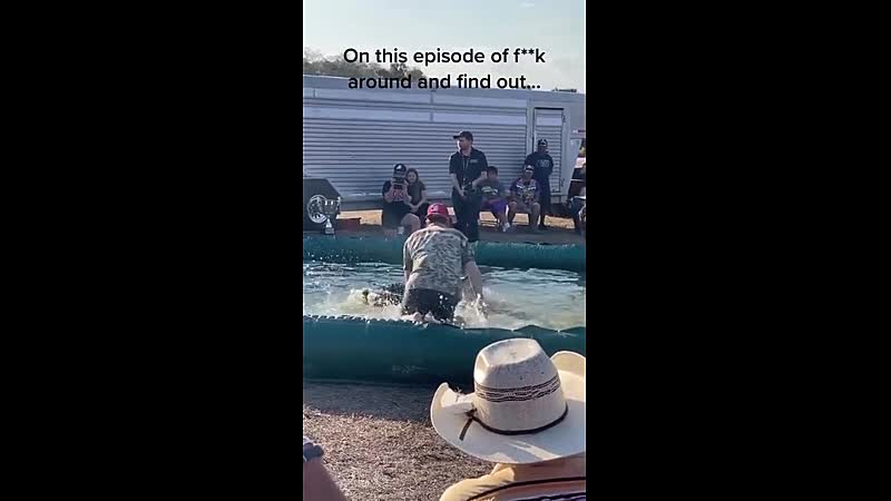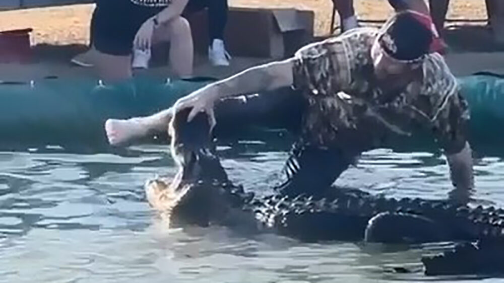 Terwijl wij hier op een zondagmiddag een voetbalwedstrijd kijken en de nieuwe bh-loze editie checken, houden ze er in Florida van om met alligators te worstelen. We gokken dat het een ritje naar het ziekenhuis wordt, want zijn voet heeft geen schijn van kans na zo'n deathroll.