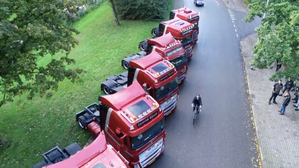 Collega's vormen erehaag met vrachtwagens voor een veel te vroeg overleden collega