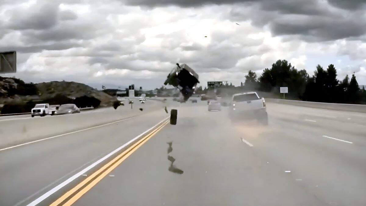 Het ene moment is er niets aan de hand en rijd je rustig over de Ronald Reagan Freeway in 'Murica, 15 seconden later word je 600 miljoenmiljard meter de lucht in geslingerd omdat één of andere redneck zelf iets teveel aan zijn #pickup heeft gesleuteld waardoor een band losraakt en onder een Kia belandt. De bestuurder raakte gelukkig niet gewond, maar hij kon ongetwijfeld een schone onderbroek regelen.