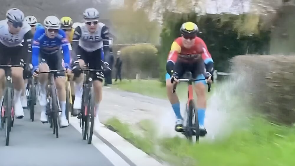 Tijdens de koers in de Ronde van Vlaanderen ging het gisteren goed mis toen een renner van Bahrain-Victorious vlak voor de eerste beklimming van de Oude Kwaremont op sneaky wijze in de kop van het peloton probeerde aan te sluiten. Hij was in zijn berekening even vergeten dat 'ie ook nog een stukje gras moest ontwijken waardoor hij zijn fiets in het peloton parkeerde. Dankzij deze niet zo'n handige actie (understatement) klapten zo'n dertig renners, waaronder Tim Wellens, Peter Sagan en Wout van Aert, tegen het asfalt.