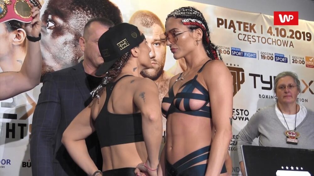 Bokser Ewa Brodnicka krijgt een bitchslap als ze haar tegenstander tijdens de stare down kust
