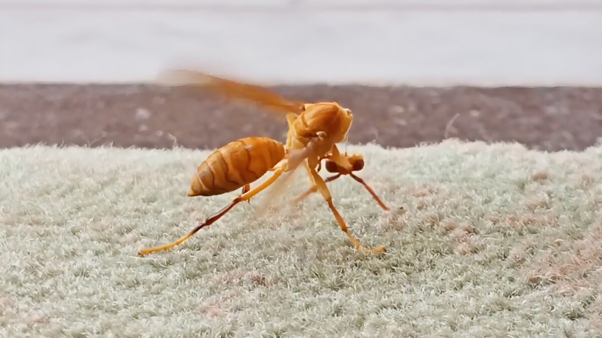 Wel eens een hoornaar gezien die zijn hoofd probeert terug te zetten?