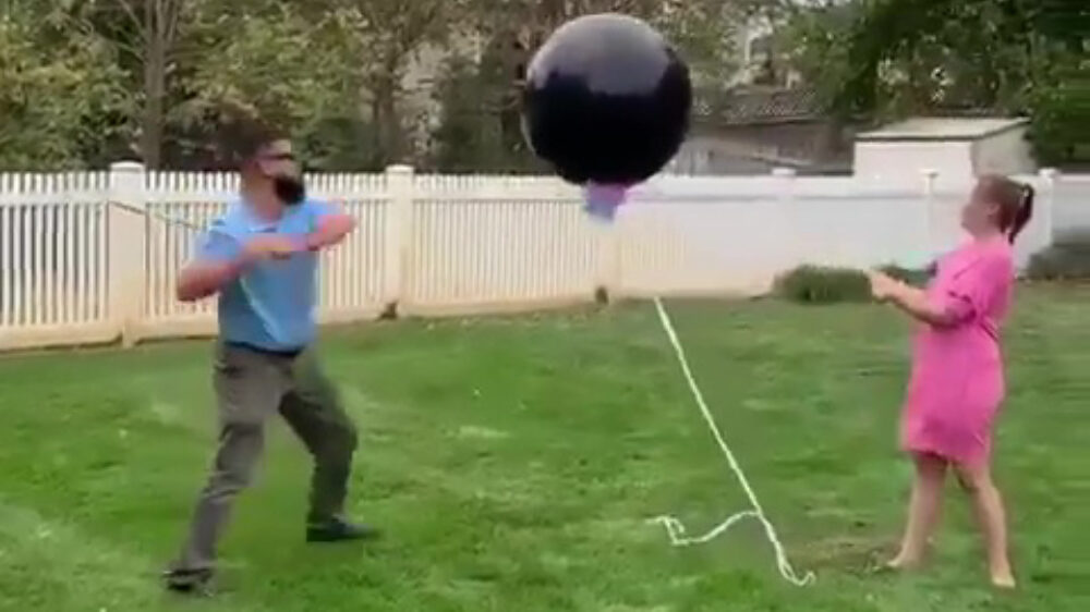 Superhip, zo'n gender reveal party. Beetje op een ballon meppen en kijken of daar blauwe of roze confetti inzit. Moet je alleen wél over een klein beetje skills beschikken, want zo'n ballon klein krijgen blijkt toch niet mee te vallen.