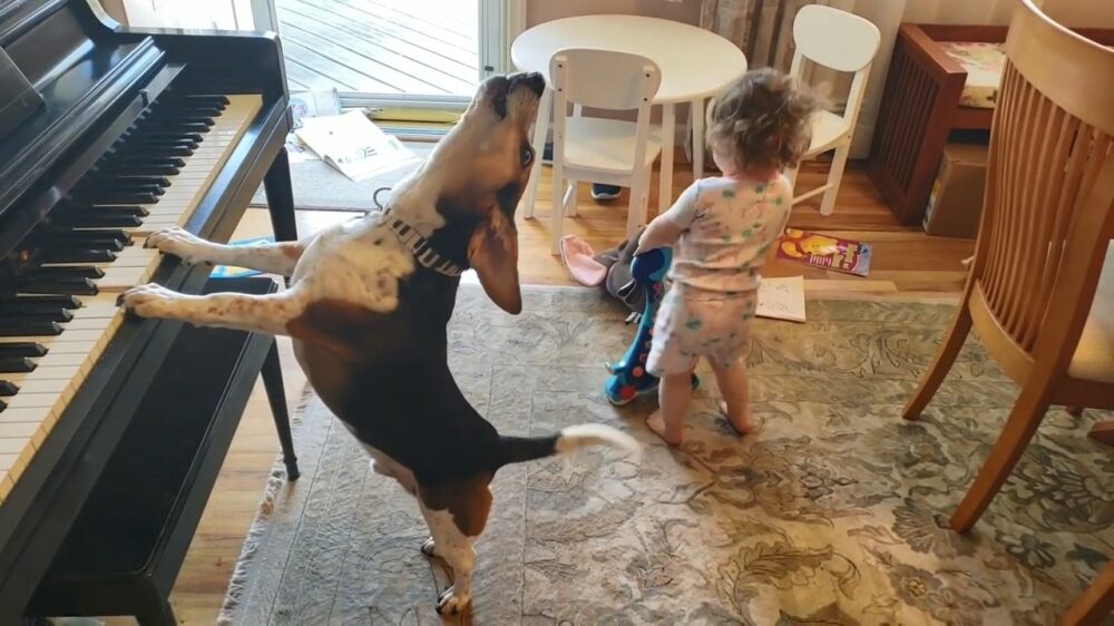 Buddy Mercury de pianospelende hond wordt deze keer bijgestaan door de keihard rockende baby girl. Rock on 🤘
