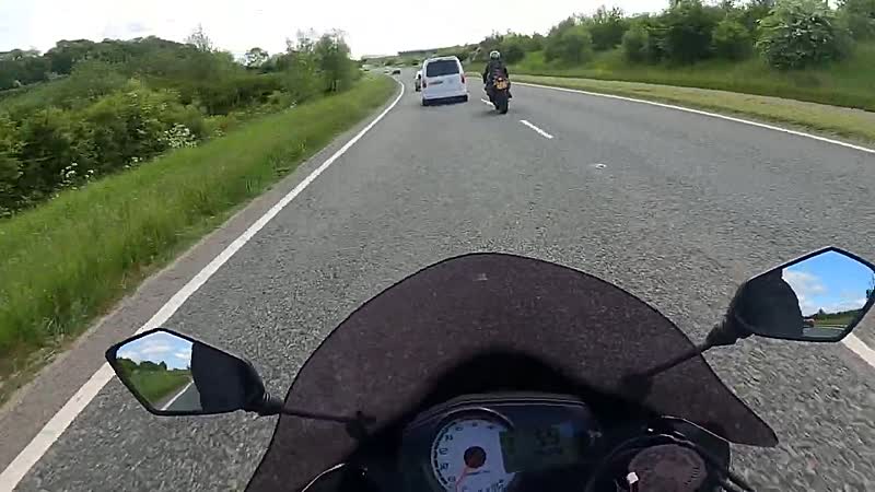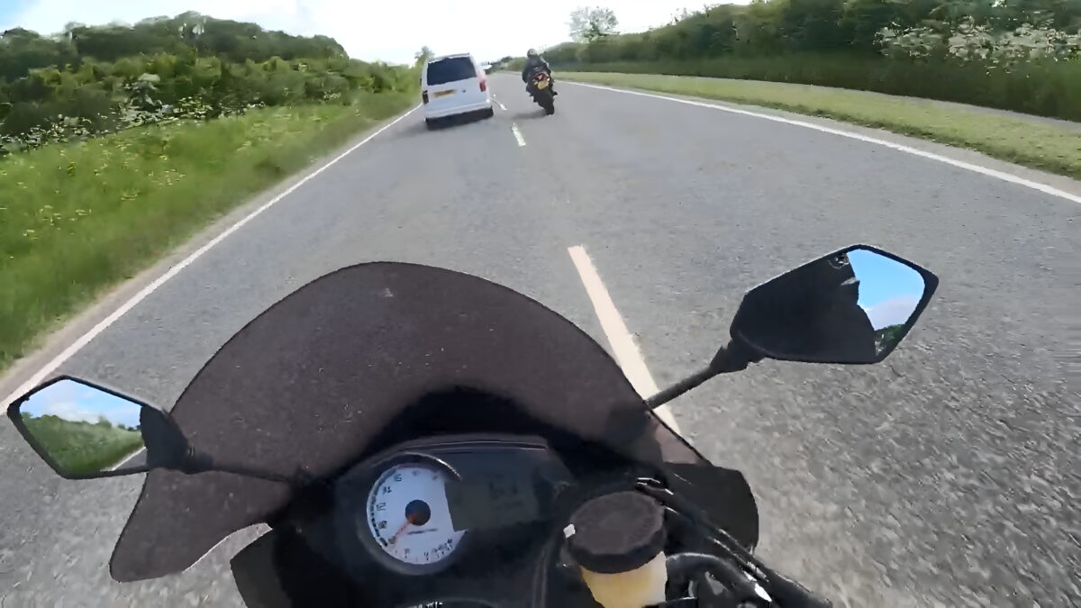 In het plaatsje Durnham bewijst een bestuurder in een wit busje maar weer eens hoe het belangrijk is om goed in je spiegels te kijken voordat je inhaalt. De motorrijder kwam er enigszins goed vanaf en hield er alleen een botbreuk in zijn hand aan over.
