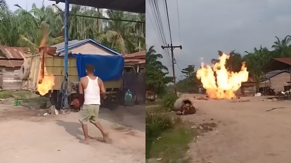 Naar het schijnt stond deze Indonesische vrachtwagen met gasflessen bij een werkplaats voor laswerkzaamheden. Als één gasfles in de fik vliegt probeert iemand het vuur te blussen met een emmer water, maar zijn pogingen waren echter tevergeefs. Goh! Dankzij de vrachtwagenchauffeur die snel wegrijdt van de drukte vielen er gelukkig geen slachtoffers.