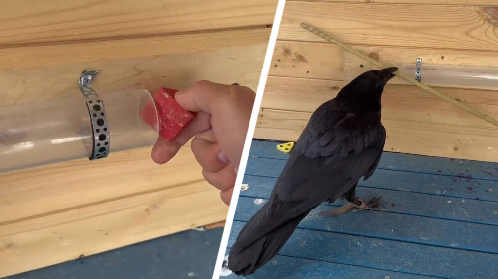 De meeste huisdieren doen alles voor een snoepje, maar deze kraai bewijst dat hij zelfs redelijk ingewikkelde problemen op kan lossen. Als er maar wat te vreten is!